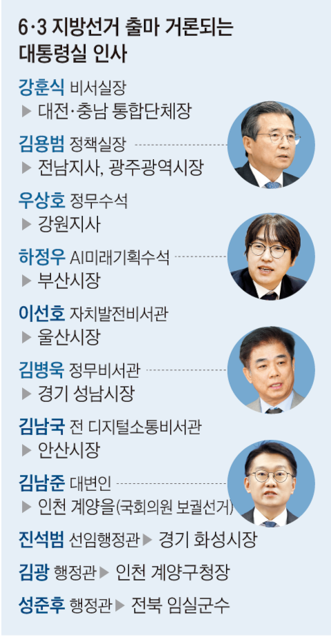 다만 정부 출범 1년도 안 돼 자신의 선거 출마를 위해 사직하는 데 대한 비판도 나온다. 국민의힘 최보윤 수석대변인은 28일 “대통령실이 ‘지방선거용 스펙 공장’으로 전락한 것”이라며 “국정은 뒷전이고 모든 것이 선거 일정에 맞춰 돌아가고 있다”고 했다.