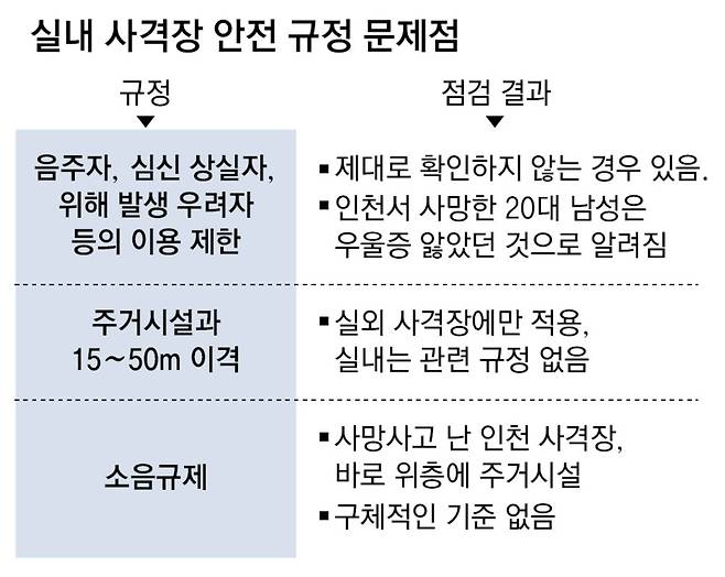 특히 실내 사격장의 입지 규정은 미비한 상태다. 현행법상 실외 사격장은 주거지로부터 15∼50m 이상 거리를 둬야 하지만, 실내 권총 사격장은 이 기준에서 제외되어 있다. 이번에 사고가 난 인천 사격장 역시 지상 17층 규모 주상복합건물의 2층에 있는데, 바로 위인 3층부터 주거시설이다. 관할 구청에는 실탄 사격장의 소음과 안전 우려로 인한 주민들의 민원이 올해만 20건 넘게 접수됐다. 이에 따라 인천경찰청은 실내 실탄 사격장이 현행법상 주거지와의 거리 규제 대상에서 제외된 점을 확인하고 경찰청에 제도 개선을 건의했다.
