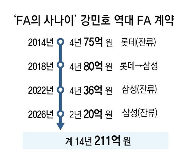 삼성 베테랑 포수 강민호(40)는 프로야구 역사상 처음으로 네 번째 자유계약선수(FA) 계약을 마친 뒤 이렇게 말했다. 강민호는 28일 원소속팀 삼성과 2년 총액 20억 원(계약금 10억 원, 연봉 총액 6억 원, 인센티브 총액 4억 원)에 계약했다. 2000년 FA 제도 도입 후 FA 계약서에 네 번 사인한 선수는 강민호가 처음이다.