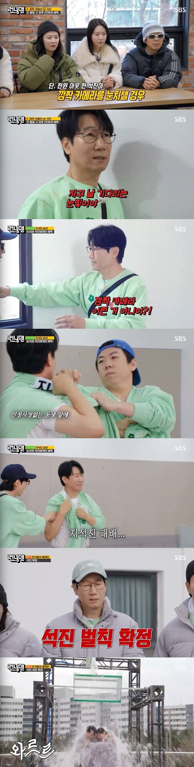 그리고 히든 미션 성공으로 베네핏을 받았음에도 꼴찌를 기록한 지석진은 벌칙이 확정되었다. 이어 벌칙공을 넣고 뽑기를 진행한 결과 양세찬이 지석진과 함께 올해 마지막 물폭탄의 주인공이 되어 눈길을 끌었다.