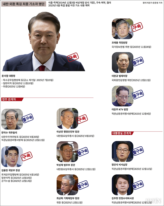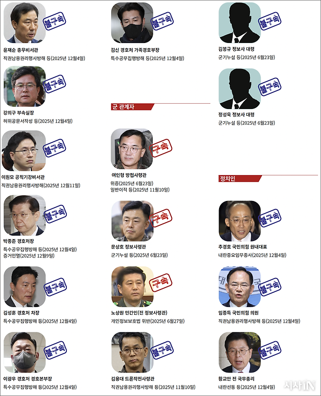 *이름-직책(2025년 12월3일 비상계엄 당시 기준)-구속 여부-혐의순