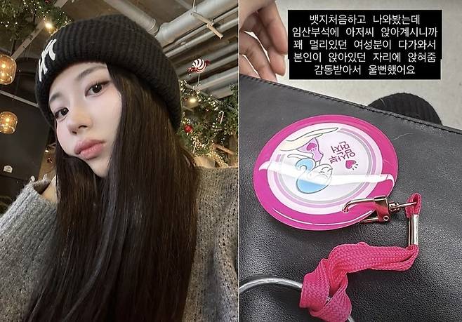 그는 "임산부 배지를 처음 달고 나왔는데 임산부석에 아저씨가 앉아 계셨고, 꽤 멀리 있던 여성분이 다가와 본인이 앉아 있던 자리를 양보해줘 감동받아 울 뻔했다"고 밝혔다.