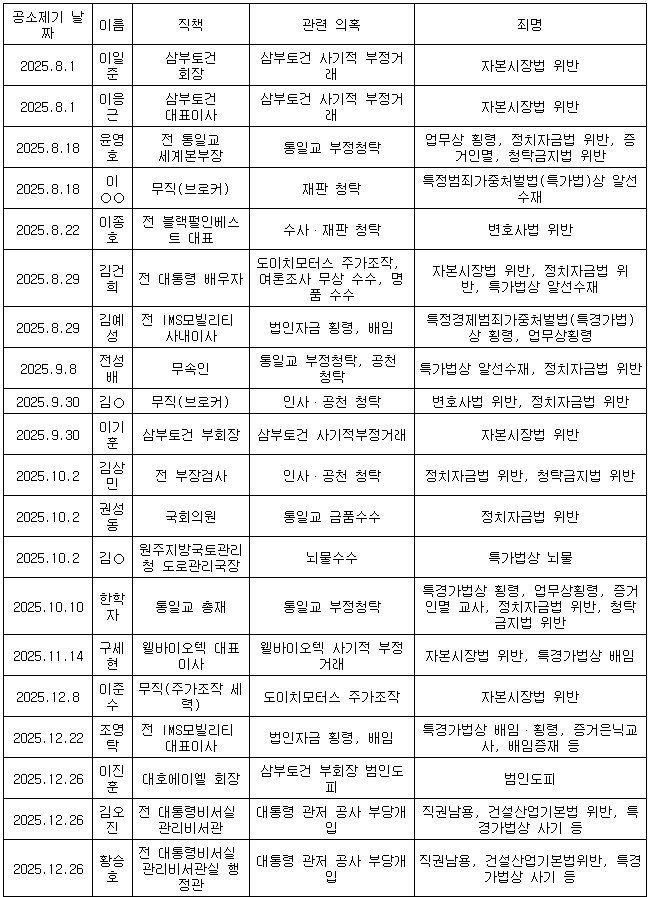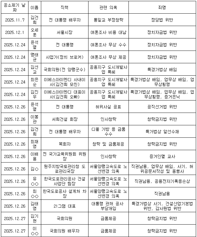[표] 김건희특검 공소제기 피의자 및 혐의