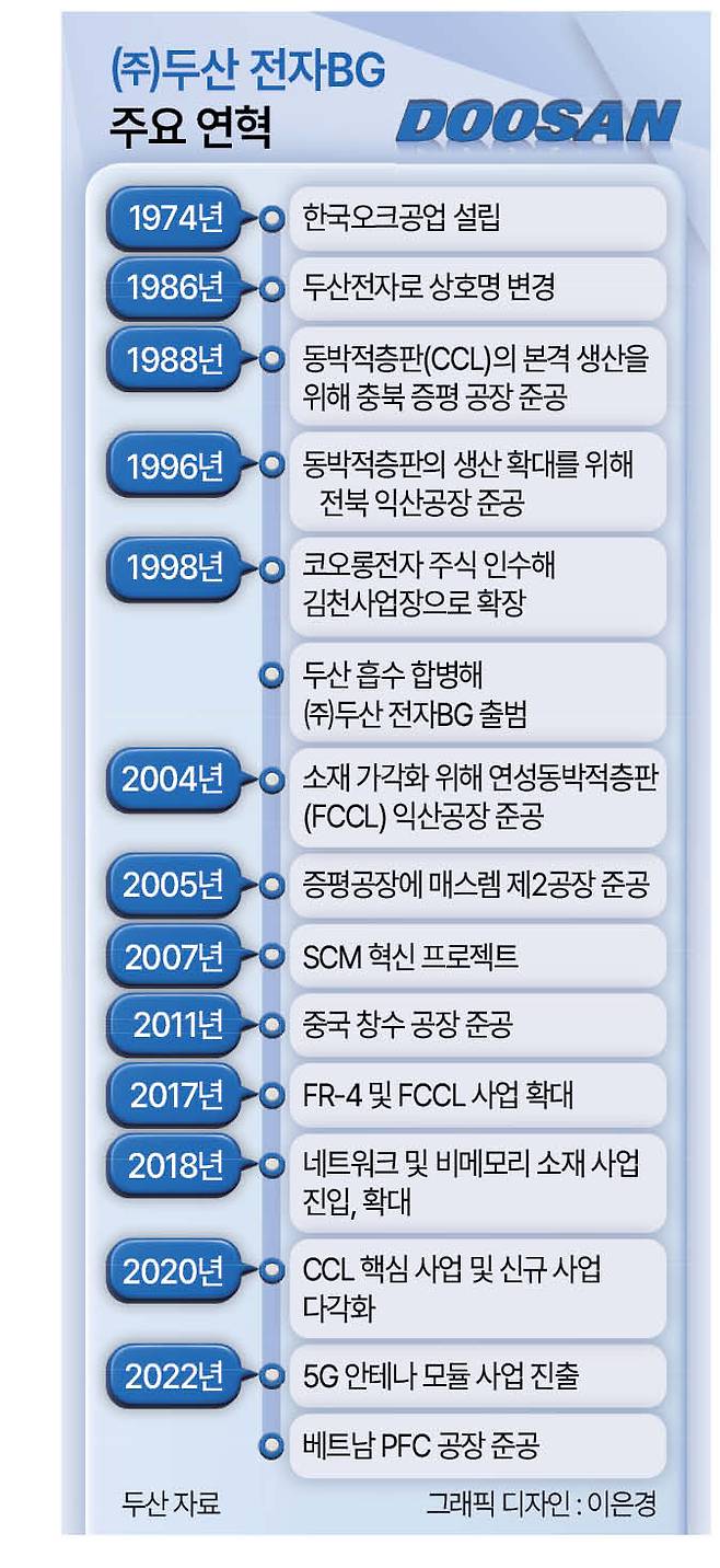 이런 변화의 배경에는 ㈜두산 전자BG(비즈니스그룹)의 빠른 성장세가 자리하고 있다. 과거 그룹 내에서 상대적으로 조용했던 전자BG 사업은 최근 AI, 고성능 컴퓨팅(HPC), 데이터센터 등 차세대 기술 트렌드와 맞물리며 급부상하고 있다. 전자BG의 핵심 제품은 동박적층판(CCL, Copper Clad Laminate)으로, 인쇄회로기판(PCB)에 들어가는 핵심 소재다. 스마트폰·통신장비는 물론 서버·AI 반도체 패키지 등 고성능 전자기기의 기반소재로 활용되며 수요가 계속 늘고 있다.