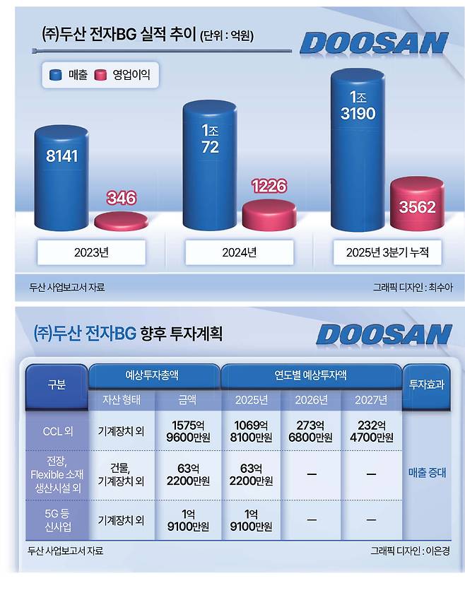 한편 전자BG는 위성통신·전기차·5G 관련 차세대 유망 산업 영역으로 사업 영역 확대에도 속도를 내고 있다. 두산은 최근 글로벌 반도체·무선 기술 기업인 스웨덴 시버스 세미컨덕터스와 차세대 위성통신 기술 개발을 위한 계약을 체결하는 등 글로벌 신사업 협업도 진전시키고 있다. 회사 관계자는 “산업 트렌드와 첨단 기술의 발전에 발맞추어, 지속적인 R&D 투자를 통해 혁신을 이어가고 있다”며 “위성통신, 전기차 등 차세대 유망산업으로 사업영역을 확대하며, 새로운 성장 동력을 확보하고 포트폴리오를 다각화해 지속 가능한 성장을 이루어 나가고 있다”고 했다. 두산 사업보고서에 따르면 2025~2027년 동안 CCL 외에도 전장 및 플렉시블 소재 생산시설에는 63억2200만원, 5G·신사업 관련 설비에는 1억9100만원 규모의 투자가 예정돼 있다.