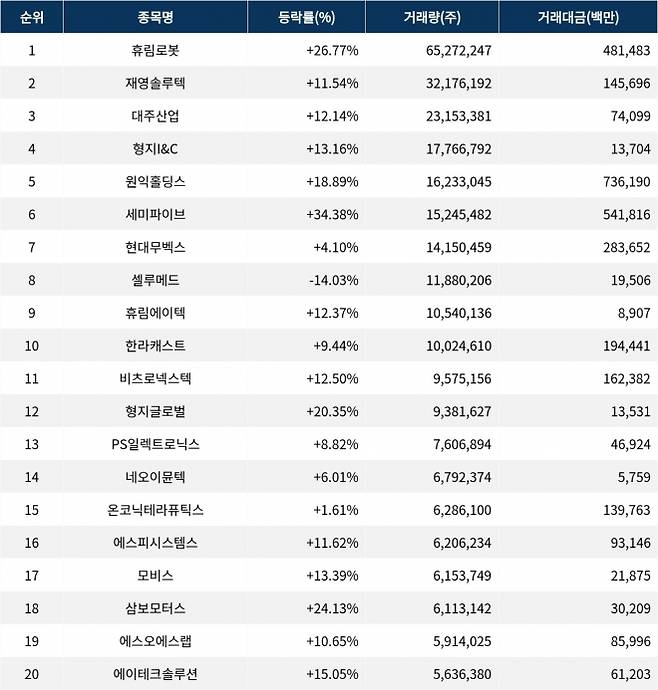한편 거래량 상위 20위권 종목들은 비츠로넥스텍(488900) ▲12.50%, 형지글로벌(308100) ▲20.35%, PS일렉트로닉스(332570) ▲8.82%, 네오이뮨텍(950220) ▲6.01%, 온코닉테라퓨틱스(476060) ▲1.61%, 에스피시스템스(317830) ▲11.62%, 모비스(250060) ▲13.39%, 삼보모터스(053700) ▲24.13%, 에스오에스랩(464080) ▲10.65%, 에이테크솔루션(071670) ▲15.05% 등의 성적을 기록했다.