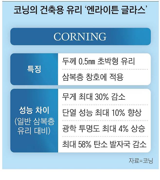 국내에 유일한 첨단 유리 제조 공장을 운영중인 코닝은 이날 국내 생산 시설을 외부에 처음 공개하며, 건축용 유리 시장 공략을 본격화하겠다고 밝혔다. 임정한 코닝정밀소재 총괄 부사장은 건축용 유리 ‘엔라이튼 글라스(Enlighten Glass)’를 소개하며 “신용카드 두께(0.76㎜)보다 얇은 0.5㎜ 유리가 삼복층 창호 유리에 들어가게 됨으로써 무게는 30% 줄고, 단열 성능은 10%, 투명도는 4% 향상된다”고 했다.