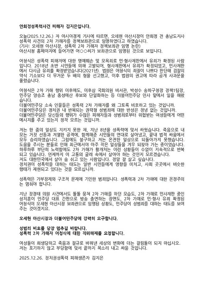 26일 김씨는 자신의 X(옛 트위터)에 성명문을 올렸다. 김씨는 언론보도를 언급하며 "오세현 아산시장이 안희정 전 충남도지사 성폭력 사건의 2차 가해자(어청식)를 정책보좌관으로 임명하였다고 한다"며 "어씨는 성폭력 피해자에 대한 명예훼손 및 모욕죄로 민·형사재판에서 유죄가 확정된 사람"이라고 했다.