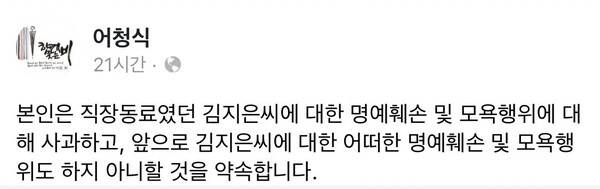 | ▲ 안 전 충남지사의 비서 출신인 어씨는 김씨를 비방하는 댓글을 달아 사실적시에 의한 명예훼손과 모욕죄 등 혐의 등으로 200만 원의 벌금형이 확정된 바 있다. 김씨는 어씨가 페이스북에 작성한 공개 사과문도 함께 첨부했다. |