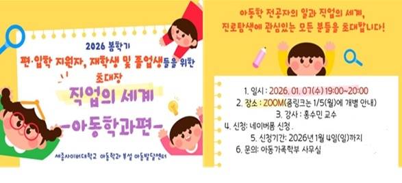 이번 특강은 2026 봄학기 편·입학을 준비하는 예비 아동학 전공생뿐만 아니라 재학생과 졸업생, 아동학 전공에 관심 있고, 참여를 원하는 사람은 누구나 참여할 수 있다. 2026년 1월 4일(일)까지 세종사이버대학교 아동가족학부 사무실로 문의해 확인할 수 있다.