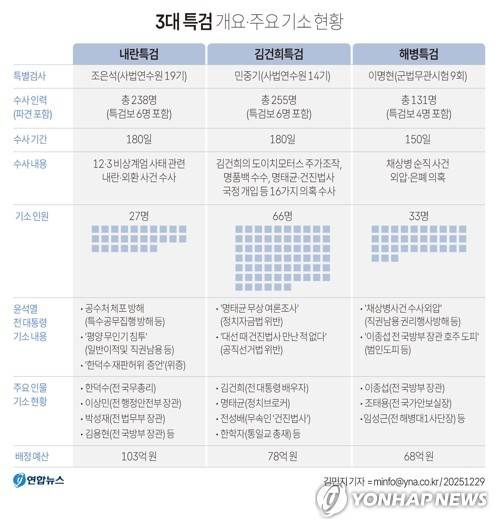 (서울=연합뉴스) 김민지 기자 = 12·3 비상계엄 선포와 이후 이어진 정권 교체로 헌정사상 처음 동시 가동된 '3대 특검'이 29일 김건희 특검팀 수사 종료 발표와 함께 막을 내렸다. 3대 특검은 150∼180일의 수사 기간 윤석열 전 대통령을 포함해 총 24명을 구속하고 121명(중복 인원 제외)을 재판에 넘겼다.