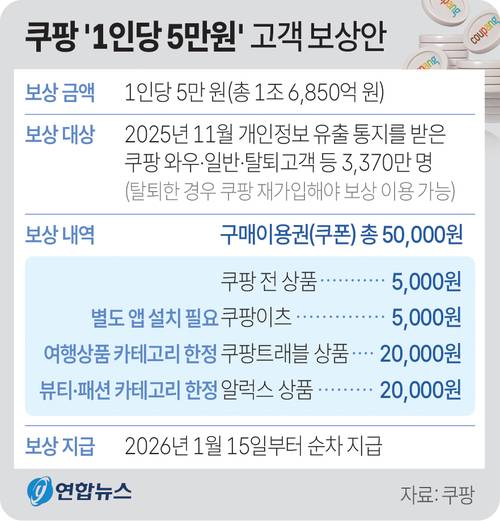 29일 쿠팡은 이용자 개인정보 유출과 관련해 총 1조6천850억원 규모의 보상안을 마련했다고 발표했다. 보상 대상은 개인정보 유출 통지를 받은 고객을 포함해 쿠팡 와우·일반·탈퇴 고객 등 3천370만명으로 내년 1월 15일부터 1인당 5만원 상당의 이용권을 지급하겠다는 계획이다. → 표 참조