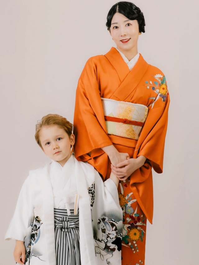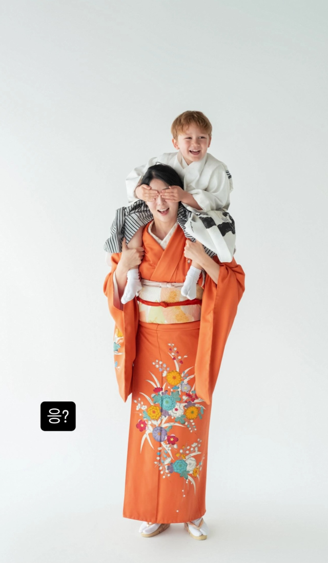 젠은 화이트 계열 기모노를 입고 장난기 가득한 표정을 짓고 있다. 순수와 시작을 상징하는 색감은 아이의 존재감을 더욱 강조하고, 사유리는 그 옆에서 한 발 물러난 듯한 자세로 아이를 감싸 안는다. 사진 속 구도 자체가 ‘설명하지 않는 가족의 형태’를 보여준다.