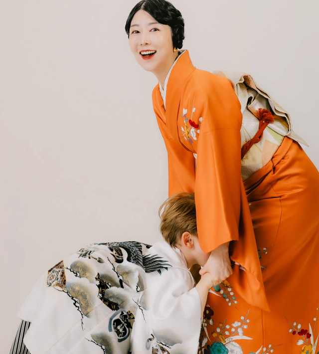 헤어스타일 역시 인상적이다. 잔머리 없이 깔끔하게 정리된 클래식 업스타일은 기모노의 격식을 해치지 않으면서도 차분한 인상을 완성한다. 사유리의 웃는 얼굴과 어우러져 사진 전체에 안정감을 더하며, ‘엄마’로서의 중심을 또렷하게 잡아준다.