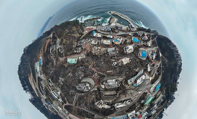 폐허가 된 석리마을 산불로 폐허가 된 경북 영덕군 영덕읍 석리마을을 3월28일 ‘드론 파노라마’로 촬영했다. 지난 3월 일어난 경북 산불로 산림 9만9200㏊ 규모가 피해를 입고 사망 30명 포함 총 75명의 인명 피해가 났다. 역대 최악의 규모다. 축구장 크기(0.714㏊)로 환산할 경우 약 13만9000개, 여의도 면적(290㏊)의 342배, 서울 면적(6만523㏊)의 1.64배에 달한다. 성동훈 기자