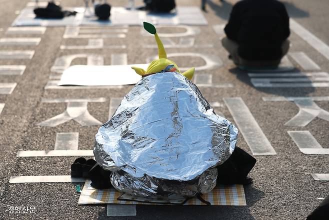 ‘키세스’ 하면 이제 우리는 초콜릿 말고 하나의 정의를 더 떠올린다. 4월4일, 윤석열 전 대통령의 탄핵 선고날이었다. 시민들은 저마다 간절한 마음으로 헌법재판소 인근 도로에서 밤을 새웠다. 이른 아침 은색 방한포를 덮은 ‘키세스 부대’ 시민이 밝아오는 햇볕 속에 앉아 있다. 지난겨울부터 국회를, 남태령을, 관저 앞을 지키며 연대한 시민이다. 정효진 기자