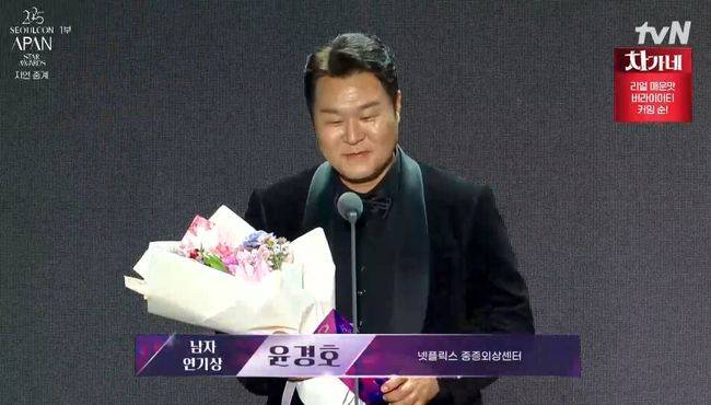 윤경호는 "사실 올 초에 너무 '중증외상센터'로 많은 사랑을 받아서 저는 사실 상을 받은거나 다름없다고 생각하고 살았다. 근데 이렇게 연말에 이렇게 영예로운 상 주셔서 너무 감사하다. 제가 늘 상하고는 거리가 멀었다. 상을 받는다는게 얼마나 큰 의미인지 알고 있기 때문에 사실 살면서 이런 상 못 받아도 연기로 먹고만 살수 있으면 행복하다고 다짐하면서 살아왔다"며 울컥하는 모습을 보였다. 그는 "왜냐면 지금도 실력있는 대단한 사람들이 곳곳에서 이런 기회가 없어도 묵묵히 자기 연기 열심히 하는걸 알고 있기 때문이고 이런 상 받기 위해 얼마나 큰 찬스가 와야하는지 안다. 작품도 사랑받아야하고 배역도 사랑받아야하고, 쟁쟁한 후보들 사이에서 선택돼야한다는게 참 기적같은일 아니냐. 그 기적같은 일을 만들어주신 '중증외상센터' 식구들 너무 감사드린다"고 진심어린 소감을 전했다.