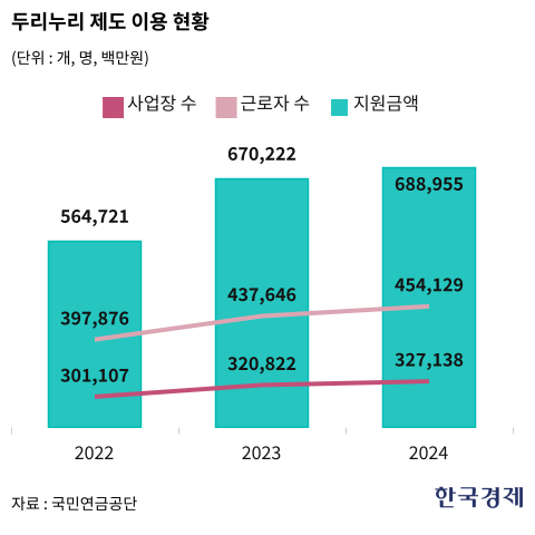 이날 국민연금공단에 따르면 이러한 두루누리 제도를 통해 국민연금 보험료를 지원받은 근로자 수는 지난해 45만4129명으로 집계됐습니다. 사업장 수는 32만7138곳, 지원금액은 6889억5500만원에 달했습니다.