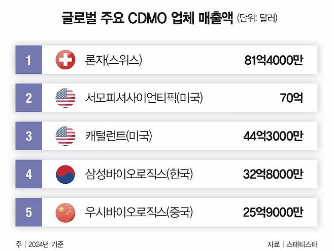 삼성바이오로직스는 지난해 매출액 기준 세계 4위 CDMO 업체다(표 참조). 5위에 해당하는 중국 우시바이오로직스와 북미시장을 놓고 치열한 다툼을 벌여왔다. 최근 미국 메릴랜드주에 있는 바이오의약품 생산시설을 인수하기로 하면서 '탈중국'을 선택한 기업들의 대안으로 부상했다는 평가를 받는다.