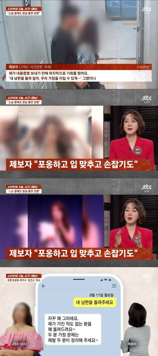 제보자는 "3월 초에 (여가수에게) '남편이랑 무슨 사이냐'고 물어봤더니 친구 사이고 자기한테 이런 식으로 연락하면 소속사 통해서 고소하겠다고 했다. 그런데 알아봤더니 같이 살고 있더라. (CCTV를 보면) 둘이 있으면 포옹하고 키스하고 스킨십을 했다. 내용증명 보내기 전에도 '가정을 지킬 수 있게 내 남편을 돌려달라'라고 마지막 기회를 줬다. 그랬더니 '제가 가지지도 않은 분을 왜 달라고 저한테 그러시냐'고 하더라. (상간녀) 소송 중인데 어떻게 방송에 나와서 웃고 그럴 수가 있냐"며 분통을 터뜨렸다.