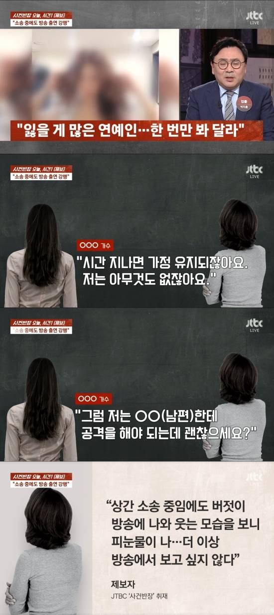 여가수는 "제가 다 책임져야 되는 상황이다. (프로그램) 위약금도 많이 나올 것 같다. 그걸 제가 감당하기에는 (힘들다)"면서 "제가 가수로 노래할 수 있게만 해주시면 조금만 봐주시면 어떻게든 해보겠다. 시간이 지나면 가정 유지되지 않나. 저는 아무것도 없다"고 호소했다. 또한 "제가 죽으면 두 분도 더 힘들 것 아니냐. 저는 ㅇㅇ(남편) 한테 공격을 해야 하는데 괜찮냐"고 자신의 목숨과 남편으로 되려 협박을 하는 뻔뻔한 태도를 보여 분노를 자아냈다.