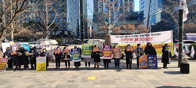 | ▲ 12월 17일 파업 집회 국민건강보험고객센터 상담사들이 지난 12월 17일 하루 파업을 하고 결의대회를 개최하고 있다. |