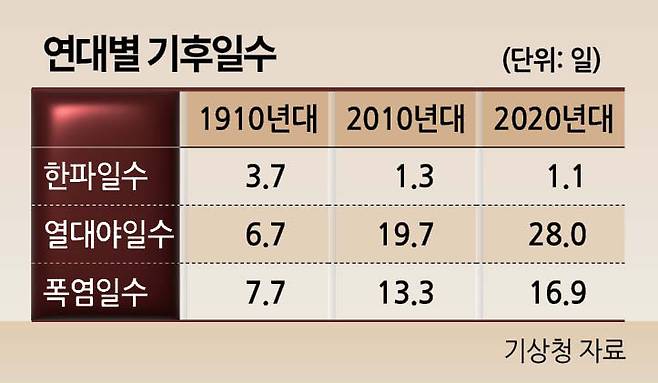 특히 폭염 일수와 열대야 일수는 모두 2010년대 이후 급격히 늘어난 것으로 나타났다. 2020년대에 각각 16.9일, 28.0일로 가장 많이 발생했다.