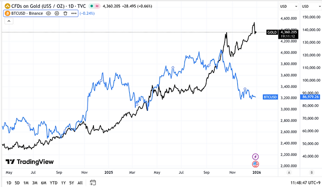 다만 금값 하락에도 비트코인은 반등하지 못했다. 금과 비트코인은 도널드 트럼프 미국 대통령 취임 이후 지속적으로 엇갈린 흐름을 가져가고 있다.