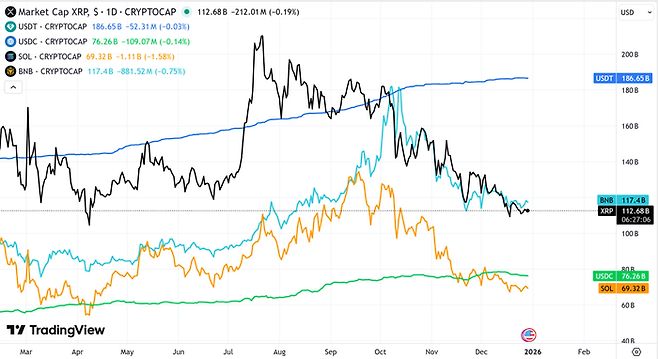 전체 시총 3~7위권은 스테이블코인인 USDT와 USDC만 무난한 흐름을 보이고 있고 BNB, XRP, SOL은 급격히 감소하고 있다. 지난 10월 이후 BNB는 16.42% 감소했고, XRP는 33.87%, SOL은 38.94%의 시총이 증발했다.