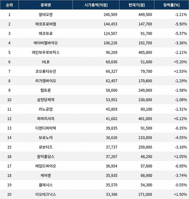 시가총액 상위 종목들은 대체로 혼조세를 보이며, 에임드바이오와 디앤디파마텍이 눈에 띄는 하락세를 보이고 있다. 반면, HLB는 강세를 나타내고 있다.