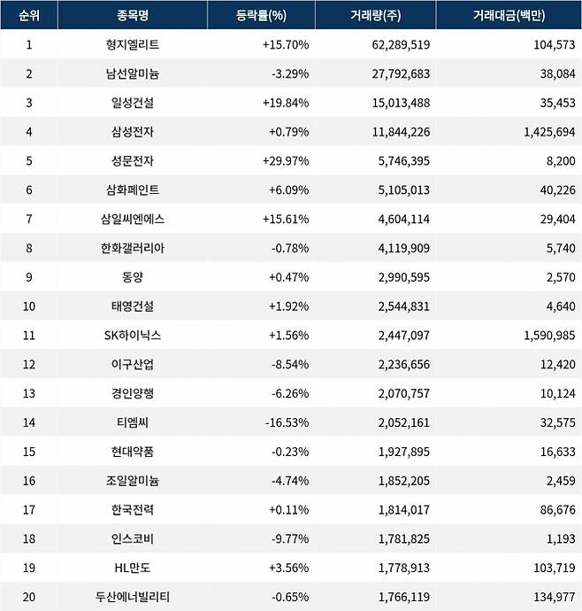 일성건설(013360)는 1,501만 주가 거래되며 19.84%의 급등세를 보이고 있다. 현재가는 2,380원이다. 삼성전자(005930)는 1,184만 주가 거래되며 현재가는 120,450원으로, 0.79%의 보합세를 기록하고 있다. 성문전자(014910)의 현재가는 1,518원으로 29.97%의 상한가를 기록하며 574만 주가 거래되었다. 삼화페인트(000390)(7,670원, +6.09%, 510만 주), 삼일씨엔에스(004440)(6,370원, +15.61%, 460만 주), 한화갤러리아(452260)(1,402원, -0.78%, 412만 주), 동양(001520)(847원, +0.47%, 299만 주), 태영건설(009410)(1,750원, +1.92%, 254만 주) 등의 순이다.