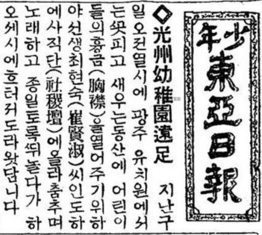 | ▲ 1925년 5월 광주지역 유치원 원아들이 보모의 인솔로 사직단으로 소풍을 가서 그 위에 올라가 “춤추며 노래하고 종일토록 뛰놀았다"는 소식을 전하는 <소년동아일보> 1925년 5월 16일자 신문. |