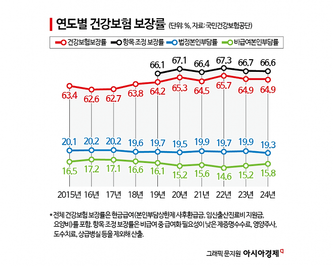 건강보험 보장률은 64.9%로 전년과 동일한 수준이었다. 법정 본인부담률이 전년 대비 0.6%포인트 감소(19.3%)하며 환자 부담이 줄어드는 듯했으나, 선택 진료나 영양제 등 비급여 본인부담률이 0.6%포인트 증가(15.8%)하면서 전체 보장률을 전년 수준에 머물게 했다.