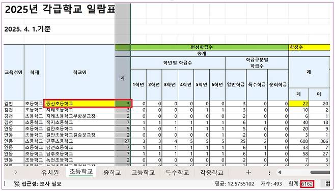 | ▲ 경상북도교육청 홈페이지의 2025년 교육통계조사 각급학교 일람표(4.1. 기준) 증산초등학교의 학급수는 3학급이며, 학생 수는 22명이다. |