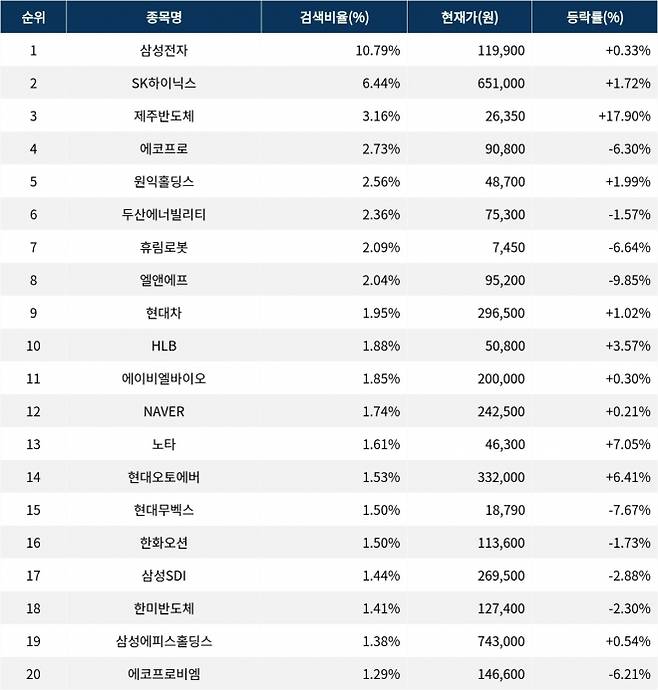 이어 검색비율 2위의 SK하이닉스(000660)는 상승률 1.72%로 상승 마감했다. 검색비율 3위의 제주반도체(080220)는 17.90% 급등했다. 검색비율 4위 에코프로(086520)는 하락률 6.30%를 기록했다. 검색비율 5위 원익홀딩스(030530)는 1.99% 상승하며 마감했다.