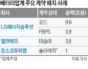 LG에너지솔루션엔 지난 17일 포드(9조6030억원), 26일 FBPS(3조9217억원)로부터 계약 해지 통보가 날아왔다. 포드가 전기 픽업트럭 생산을 중단하고, 배터리관리시스템(BMS)과 배터리 팩을 제조하는 FEBS의 자회사 FBPS가 전기버스 사업을 철수하기로 한 영향이다. 8월에는 포스코퓨처엠이 맺은 9450억원어치의 에너지저장장치(ESS)용 양극재 공급 계약이 해지됐다.