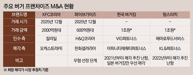 반면 버거킹과 맘스터치는 대표적인 장기 매물로 꼽힌다. 사모펀드 어피니티에쿼티파트너스가 지난 2016년 인수한 버거킹은 수년째 새 주인을 찾지 못하다 지난 11월 일본 버거킹만 골드만삭스 대체투자사업부에 7500억원에 우선 매각됐다. 한국 버거킹은 원매자를 찾지 못 해 매각이 지연되는 중이다. 직영점 비중이 높고 로열티 구조가 경직돼 있어 인수 후 수익성을 크게 높이기 어렵다는 평가가 밸류에이션 상한을 낮추는 요인으로 작용한다.