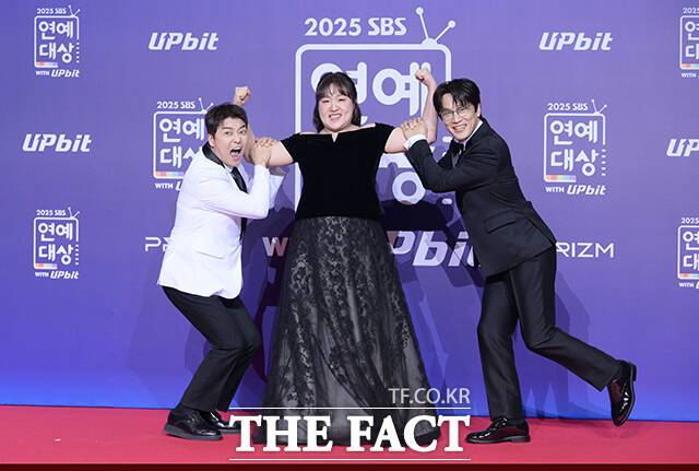 [더팩트ㅣ박헌우 기자] SBS 연예대상 MC 전현무와 이수지, 차태현(왼쪽부터)이 30일 오후 서울 마포구 SBS 프리즘타워에서 열린 'SBS 연예대상 포토월에 참석해 포즈를 취하고 있다.