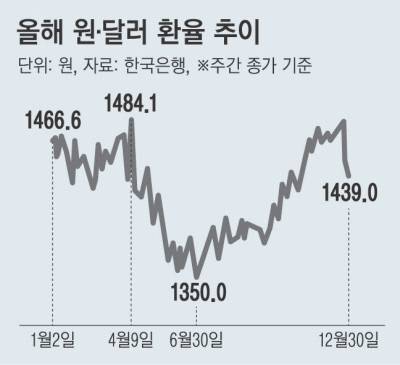올해 외환시장 마지막 거래일인 30일 원·달러 환율이 1439원에 마감했다. 연간 평균 환율은 처음으로 1400원을 넘기면서 1998년 외환위기 때보다도 높은 역대 최고치를 기록했다.