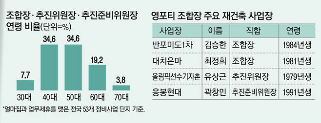 하지만 조합장이 젊다는 점이 일부 사업장에선 문제가 되기도 한다. 특히 소유주 상당수가 60대 이상인 곳에선 젊은 조합장을 신뢰하지 않는 경우도 있다. 40대인 강남의 A정비사업 관계자는 “일을 하다 보면 ‘버르장머리가 없다’며 공격을 받을 때가 있다”며 “아무래도 기존의 관습을 젊은 시각으로 바꾸려 하면 저항이 나온다. 협력사 종사자들도 나이가 많은 편”이라고 말했다. 또 실무자나 중간 관리자 직급이 많은 3040세대는 조합 일에 집중할수록 본업에 소홀해질 수밖에 없다는 점을 현실적인 어려움으로 꼽았다.
