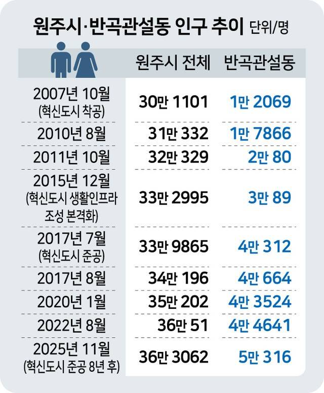 원주시가 공개한 인구 현황을 분석한 결과, 반곡관설동 인구가 2025년 11월말 기준 5만 316명으로 5만명 선을 넘어섰다.