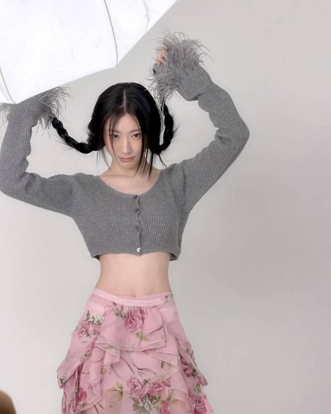 공개된 사진 속 채령은 회색 크롭 가디건+핑크 플라워 러플 스커트로 달콤하면서도 쿨한 무드를 선보였다.