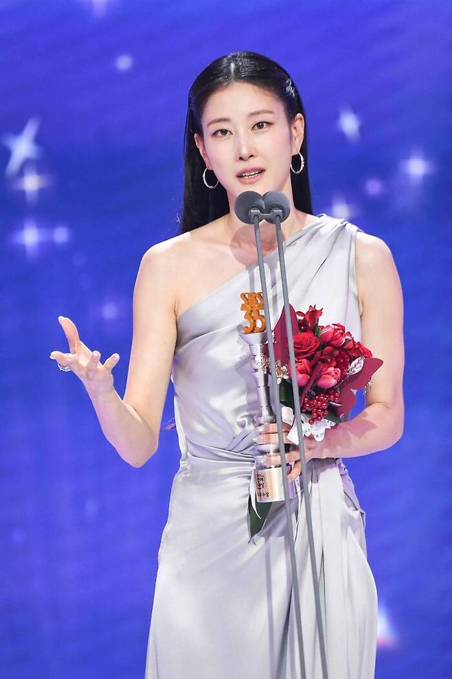 여자 최우수상은 부문 구별 없이 시상이 진행됐고, '동상이몽2-너는 내 운명'과 '골 때리는 그녀들'의 이현이, 김진경에게 돌아갔다. "지난 5년 동안 밥 먹고 축구만 했다"는 김진경은 "그렇게 사랑하는 축구를 잠시 쉬어야 할 거 같다. 제 뱃속에 2세가 잘 자라고 있다. 축구를 쉬는 게 아쉽지만, 건강해져서 돌아오겠다"라며 임신 소식을 깜짝 전했다. 김진경은 지난해 축구선수 김승규와 결혼했다.
