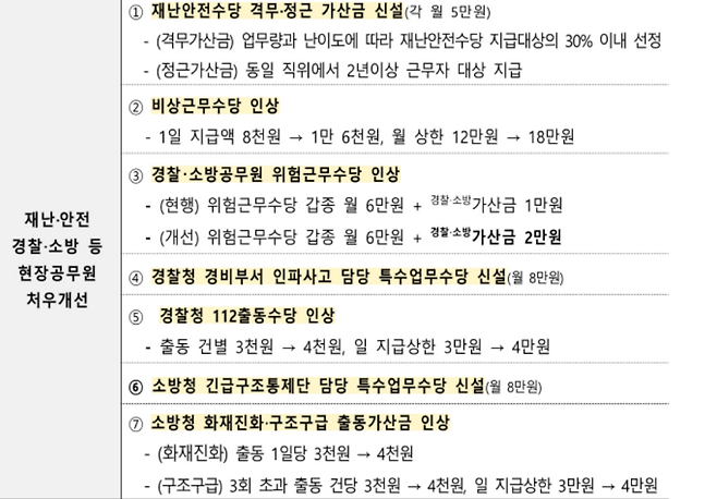 위험근무수당 인상과 특수업무수당 신설은 이 위험을 급여 항목으로 처음 명시한 조치입니다.
