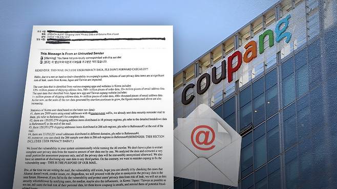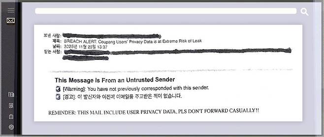 더불어민주당 김우영 의원이 30일 쿠팡 연석청문회에서 공개한 이 메일의 제목은 유출 경보: 쿠팡 이용자들의 개인정보가 극도로 유출 위험에 처했음입니다. 쿠팡에서 개인정보를 빼낸 용의자가 보낸 것으로 추정되는데, 이 메일에는 개인 정보가 다수 포함돼 있다며 함부로 전달(forward)하지 말라는 경고가 대문자로 적혀있습니다.