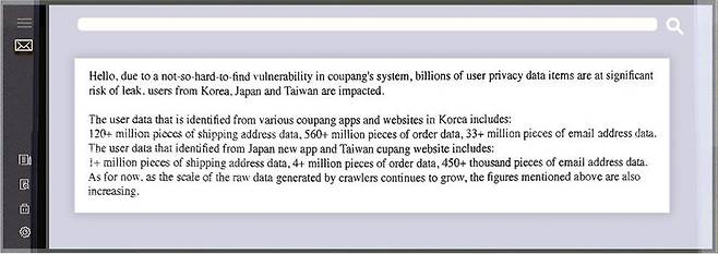 메일은 쿠팡 시스템의 취약점을 찾기 어렵지 않았다며, 한국을 비롯해 일본, 대만 이용자들이 피해대상이라고 밝혔습니다.