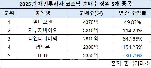연간 투자 성적표를 살펴보면, 개인 순매수 상위 5개 종목의 연간 수익률 평균은 187.1%로 집계됐다. 개별 종목 별로는 HLB(-30.79%)를 제외하고 모든 종목이 큰 폭 상승했다. 디앤디파마텍이 650% 가까운 급등세를 기록했고, 펩트론과 지투지바이오도 각각 150%, 110%대의 상승률을 보였다. 코스닥 대장주 알테오젠은 49.83% 올랐다.