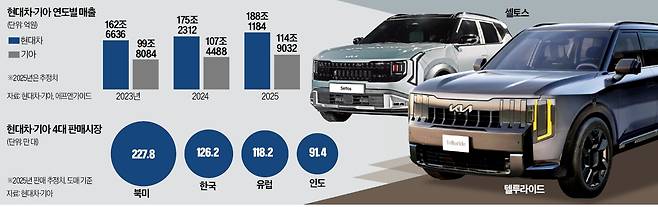 현대차그룹은 스포츠유틸리티차량(SUV)과 하이브리드카 등 값비싼 차종을 앞세워 사상 최대 매출도 달성한다는 계획이다. 현대차와 기아의 2025년 합산 매출(에프앤가이드)은 303조216억원으로, 2024년(282조6800억원)보다 7.2% 증가한 것으로 추정됐다.