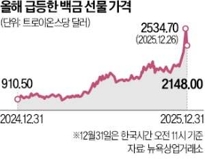 31일 미국 뉴욕상업거래소에 따르면 이날 백금 선물 가격은 트로이온스당 2148달러 선에서 거래됐다. 12월 26일엔 2534.70달러로 사상 최고치를 찍었다. 2025년 연간 상승률은 121%에 달했다. 백금족 금속인 팔라듐도 올해 80% 올랐다. 미국 관세 관련 불확실성과 금·은 등 다른 금속 가격 급등이 백금 가격을 끌어올렸다.