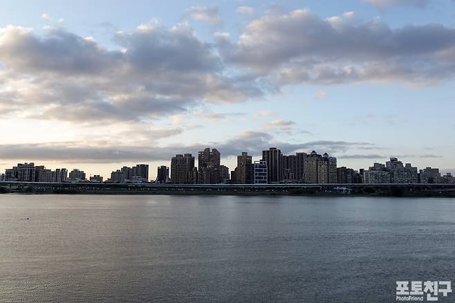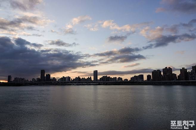 노을 질 때 강가에서 본 건물 실루엣 풍경입니다.